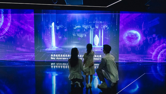 Digitale Bildschirme und Modelle zeigen die Konstruktion des Turms, den Höhenvergleich mit globalen Wolkenkratzern und die Entwicklung der Skyline der Stadt.