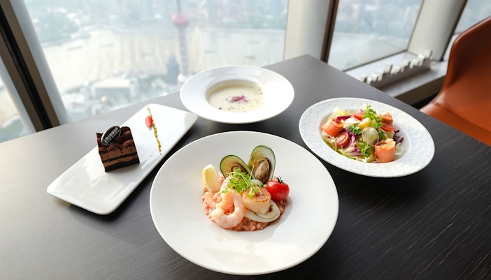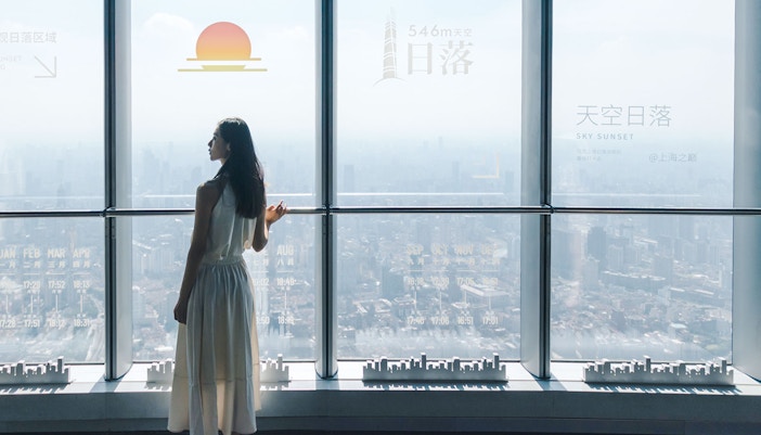 Vom Boden bis zur Decke reichende Glaswände auf 546 m bieten einen weiten Blick über Shanghai, den Huangpu-Fluss und Wahrzeichen wie Oriental Pearl Tower.