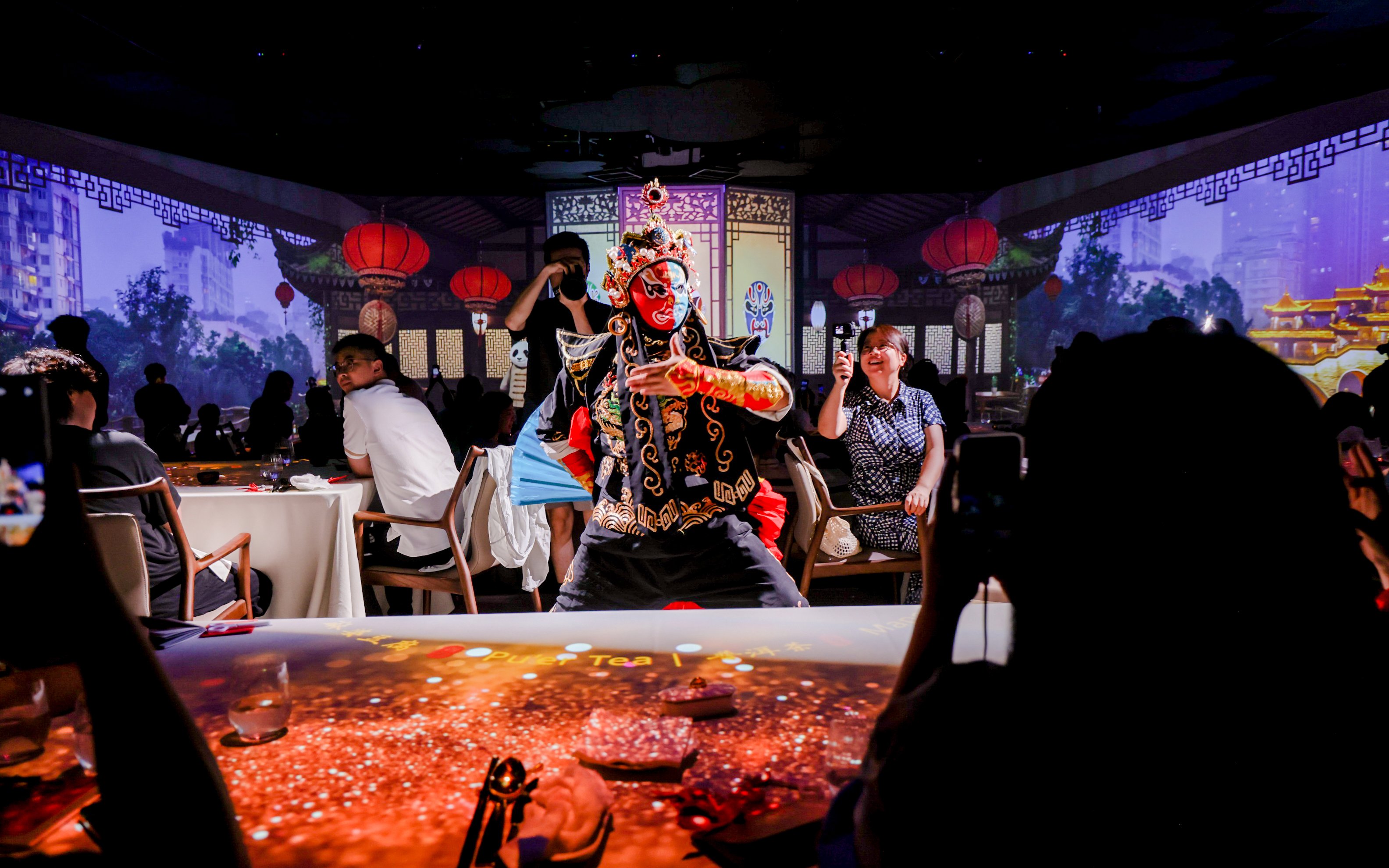 The walls transform into a continuous moving panorama inspired by China’s landscapes and cultural scenes.