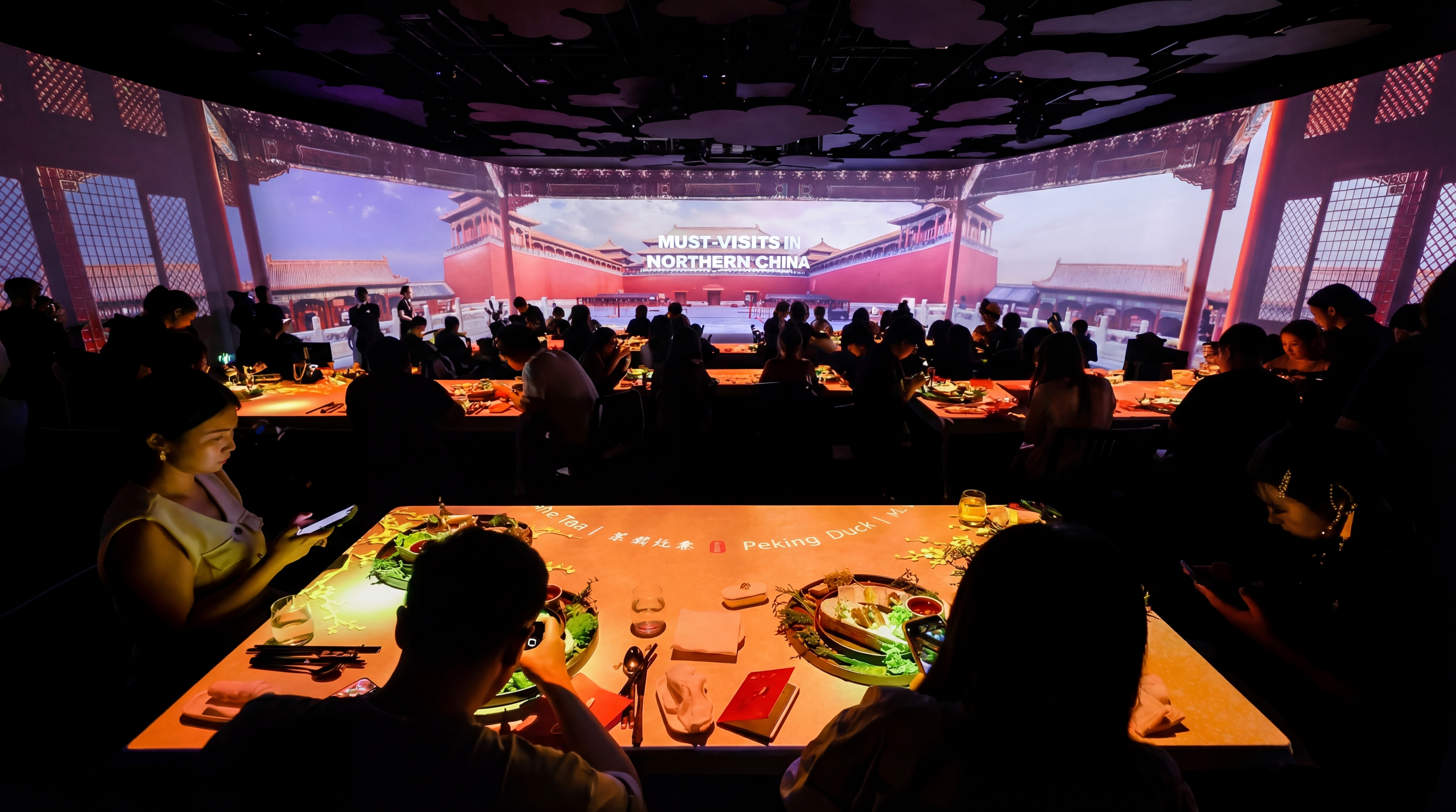 The journey is guided by a themed storyline (featuring a virtual host) while projection-mapped tables respond dynamically to each course, blending storytelling with tactile visuals.